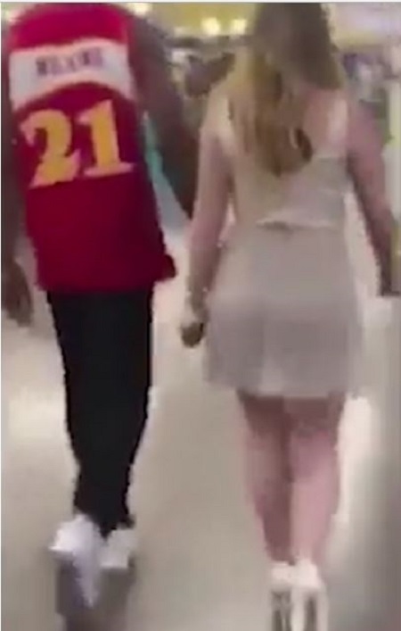 The blonde woman is wearing a white sun dress and high heels, while the man can be seen wearing a basketball jersey and hat.