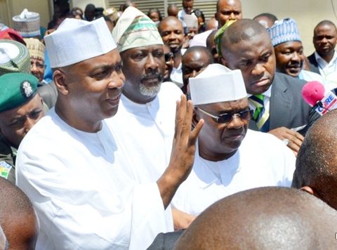 Saraki, Dino Melaye, Danjuma Goje and others after the Code of Conduct Tribunal sitting in Abuja in Abuja on Wednesday