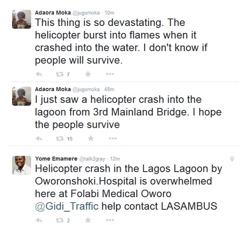 A helicopter has crashed into the lagoon at Oworo/Oko Cole area of Third Mainland Bridge on Wednesday afternoon.