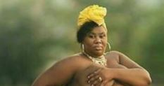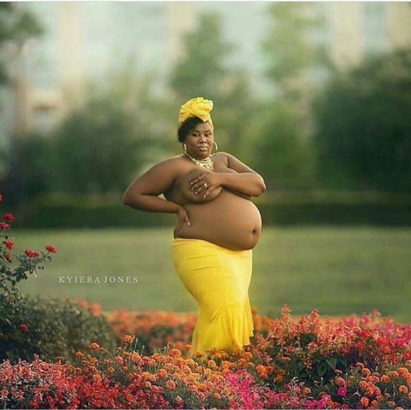 A curvy American woman has gone topless in a maternity photo-shoot taken at a natural environment. As seen in the photo, the plus-sized woman barely covered her breasts with her hand as she rocked a yellow skirt and head-tie.