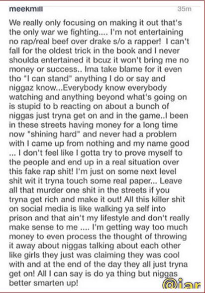 American rapper, Meek Mill has slept over his beef with Youngmoney rapper, Drake and has officially announced on the social media he is no longer interested in any war of words.