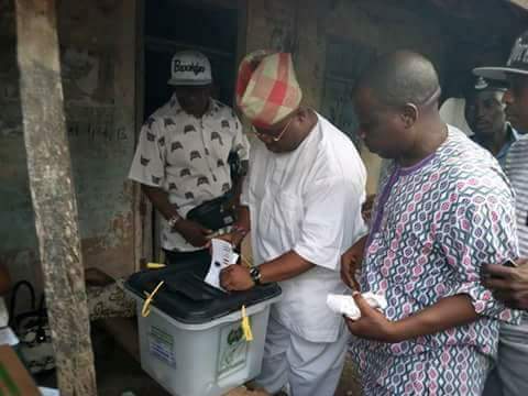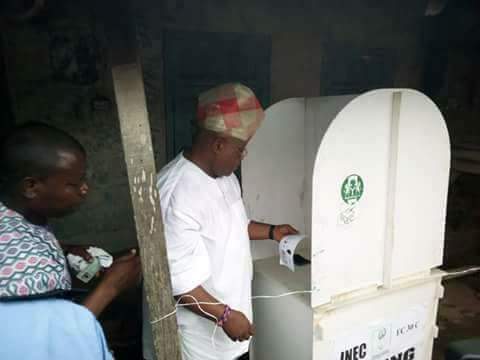 The PDP candidate of the Osun West senatorial by-election election, Ademola Adeleke, has casted his vote at his polling unit Sagba Abogunde, ward 2, unit 9, Ede.