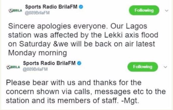 Sports Radio station, Brila FM has been offline since Saturday night. In a tweet explaining the reason for going off air, the management attributed it to the natural disaster crippling Lagos State during the raining season.