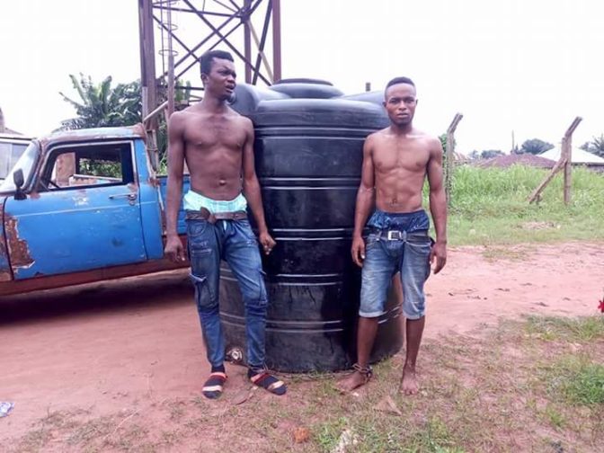 A 24-year-old bricklayer, Austin Agholor and 22-year-old, Trust Eronime who is a bus conductor were yesterday disgraced and paraded by the Agbor Gha Ihun security outfit in Delta State after they were caught stealing a Tank.