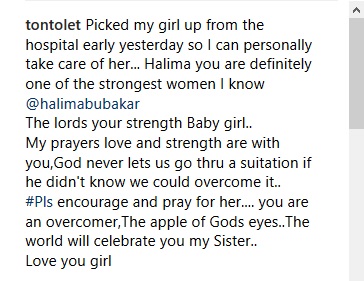 While urging Nigerians to encourage and pray for Halima's good health, Tonto posted the Kogi state-born actress' latest photo and wrote: