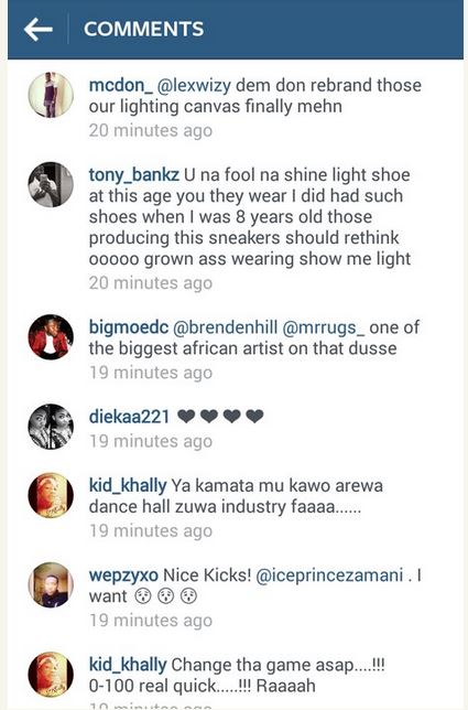 Rocking a light-up canvas has stirred up mixed reactions on the Instragram page of rapper, Ice Prince. Many of his fans believe such a footwear should be left for kids and not an adult like him.
