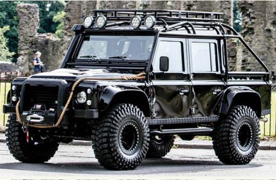 This is what you saw in James Bond's "Spectre", but was sent to Land Rover racing specialist "Bowler" and even upgraded further. The truck gets 37-inch tyres, Bilstein rally dampers, upgraded engines from 120hp to 185hp, roll cage, Recaro racing buckets, harnesses, diamond-plated parts and some heavy ropes on the bonnet.
