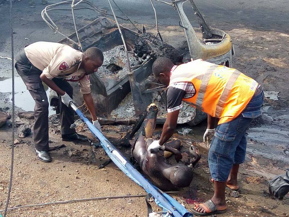 Men of the FRSC and other officials removing bodies of victims of the tanker accident (Photo credit:Frankline Madichie)