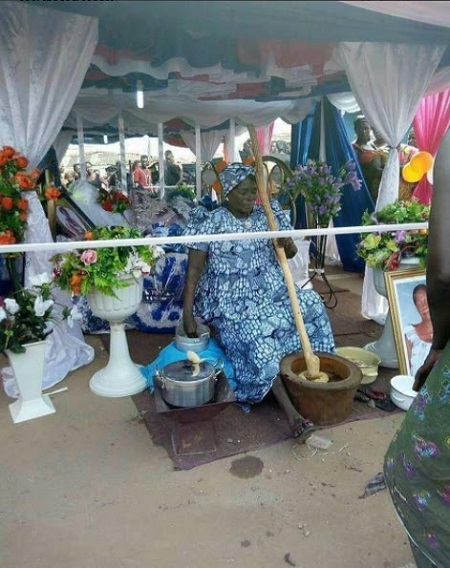 During her lying-in-state, her body was placed in a sitting position, with mortar and pestle to look like she's pounding yam and a pot of soup cooking beside her.