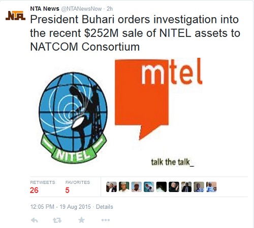 The Permanent Secretary, Federal Ministry of Communication and Technology, Dr. Tunji Olaopa told State House Correspondents on Tuesday after briefing at the presidency that President Muhammadu Buhari has ordered investigation into the sale of Nigerian Telecommunications (NITEL) and Mobile Telecommunications (MTEL) under the administration of ex-president Goodluck Jonathan.