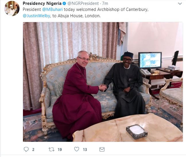 The Archbishop of Canterbury, Justin Welby on Friday, paid a personal visit to President Muhammadu Buhari at Abuja House, London. The cleric pledged to continue praying for both President Buhari and Nigeria.
