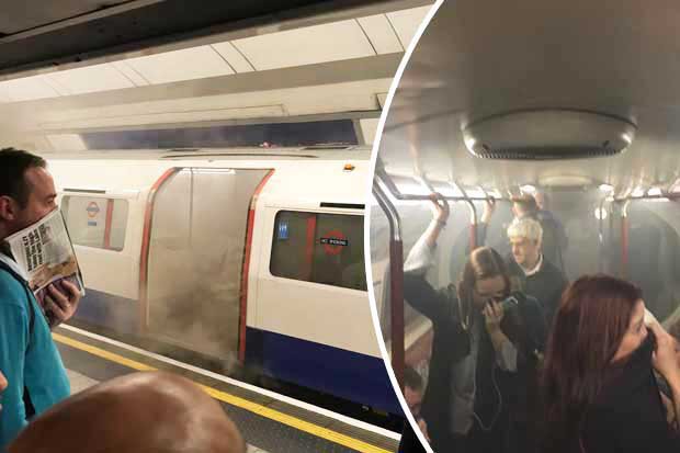 Commuters were pictured shielding their faces from thick smoke which billowed through their carriage.