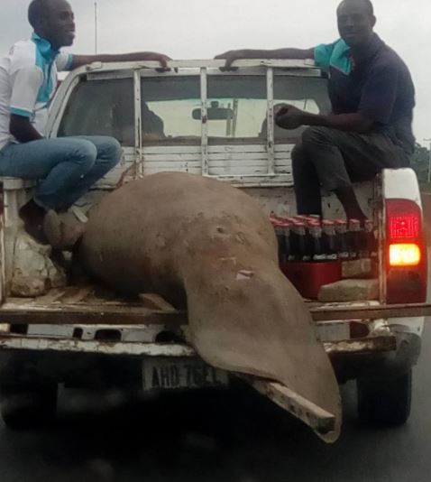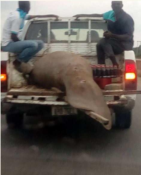 A man was left dumbfounded after sighting a massive aquatic animal being transported by some men in a Hilux vehicle in Rivers State.