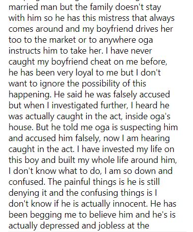 A lady has been left heartbroken after discovering her partner allegedly had s*x with his boss' side-chic leading to his sack from work.