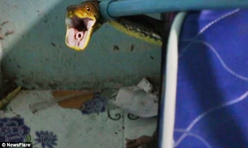 Hair-raising footage shows the angry snake biting the animal handler after rescuers arrived to help remove it from its hiding place.
