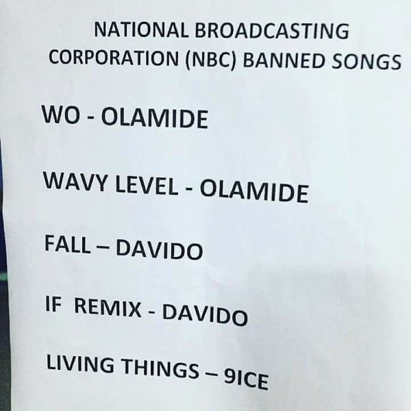 A list of the five banned songs include: Olamide‘s “Wo” and “Wavy Level“; Davido‘s “Fall” and “If (Remix)“; and 9ice‘s “Living Things.”
