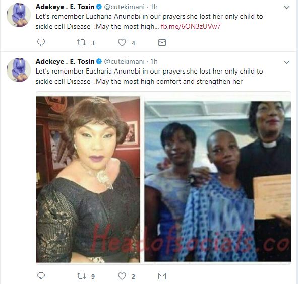 This was made public by media personality, Adekeye . E. Tosin who wrote on Twitter: "Let's remember Eucharia Anunobi in our prayers,she lost her only child to sickle cell Disease .May the most high comfort and strengthen her."