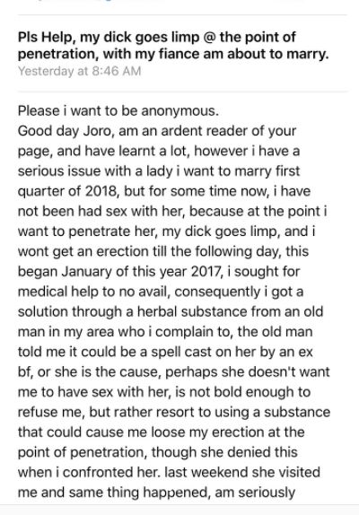 A young man appears to be jinxed after his manhood has been constantly becoming flaccid whenever he mounts his fiancee for s*x.
