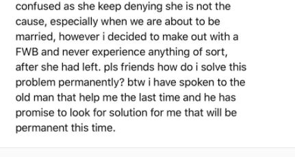 He has been finding it difficult to sleep with the woman he is supposed to marry later in the year 2018. He becomes soft on top of his lover but this didn't happen when he tried another woman.