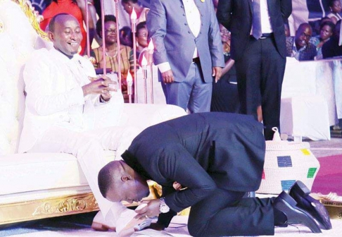 A church member kissing Prophet Elvis Mbonye's feet