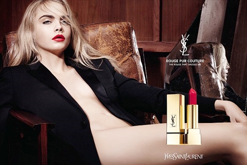 23-year-old English fashion model, Cara Delevingne, who shot to fame as a model in her late teens, is the star of Yves Saint Laurent Beauté's Rouge Pur Couture lipstick - and goes completely naked save for a blazer in the new campaign shoot.