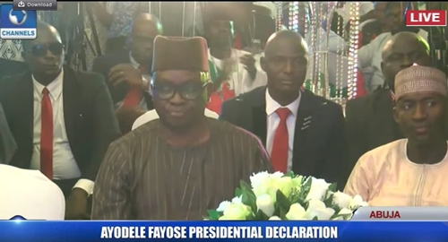 Governor Ayo Fayose's declaration of his ambition for the presidency will be aired live on Channels TV today, at 12noon#FayoseDecides