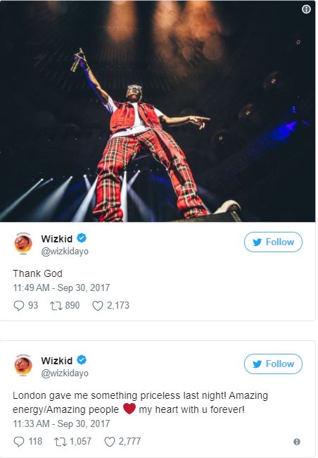 “One name @wizkidayo … EPIC !!! Last night was a movie ,thank you for a great show”, tweeted a British actor, Duayne Boa‏ @DuayneBoa.