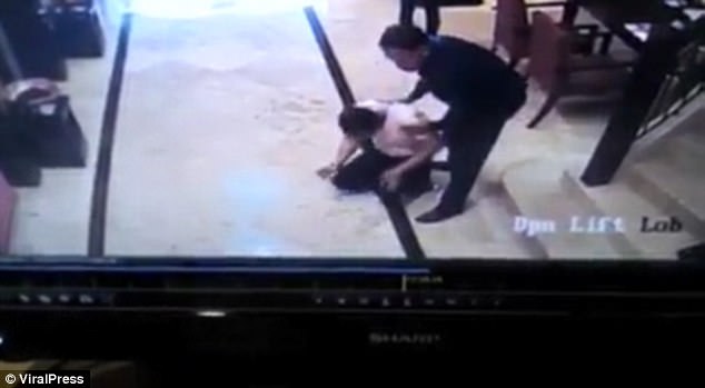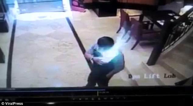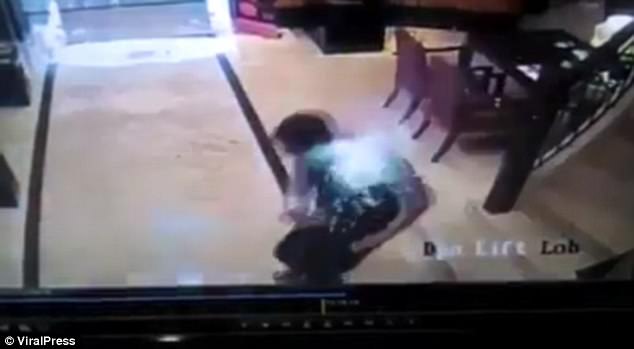 When he reached for his pocket it suddenly exploded, setting his shirt alight and sending sparks across the room.  CCTV shows Yulianto falling to the ground as an onlooker rushes to help him at Hotel Ciputra in Semarang on Saturday.