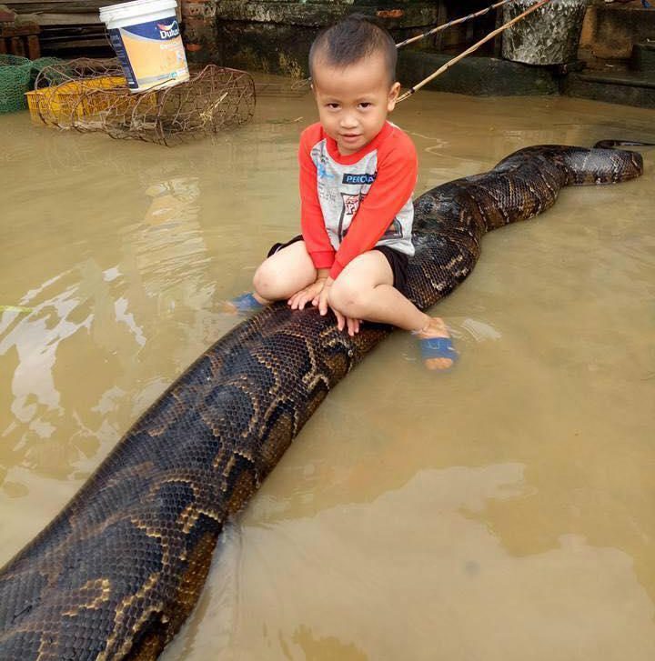 These are the really shocking photos showing a three-year-old boy riding a giant 20ft python during floods in Vietnam.