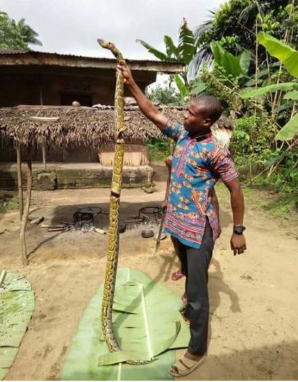 A social media user who visited his village has showed pictures of two massive pythons killed by his kinsmen.