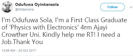 “I’m Odufuwa Sola, I’m a First Class Graduate of Physics with Electronics from Ajayi Crowther University,” she tweeted on Tuesday from her handle @MzKansola. “Kindly help me retweet. I need a Job.”