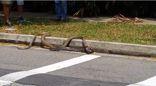 A fierce battle between a reticulated python and a king cobra which took place on a busy street has been captured on camera...Check on it!