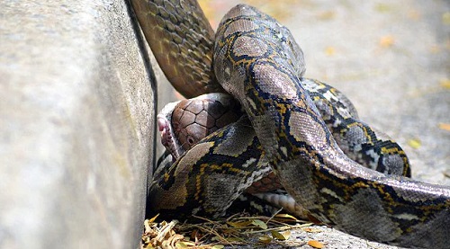 A small group of locals became eye-witnesses of the unusual fierce battle between two snakes - a reticulated python and king cobra, which took place near Nanyang Technological University campus in Singapore.