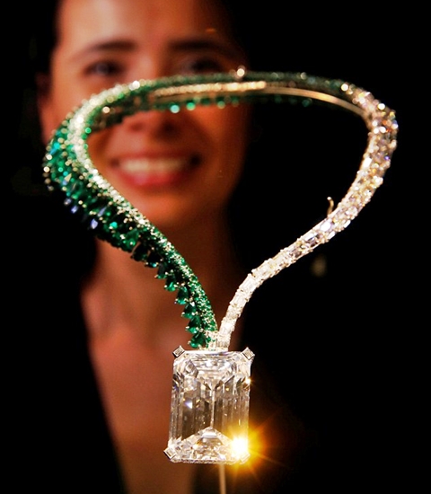 The diamond is the centerpiece of an asymmetric necklace with a trailing on the left side of 18 emerald-cut diamonds and to the right two rows of pear-shaped emeralds, offering a contrasting appearance. Gruosi believes green means good luck.