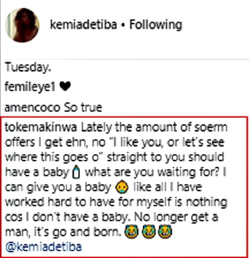 Toke agreed with the filmmaker, saying; "Lately the amount of sperm offers I get ehn, no “I like you, or let’s see where this goes o” straight to you should have a baby, What are you waiting for? I can give you a baby. Like all I have worked hard to have for myself is nothing cos I don’t have a baby. No longer get a man, it’s go and born. @kemiadetiba"