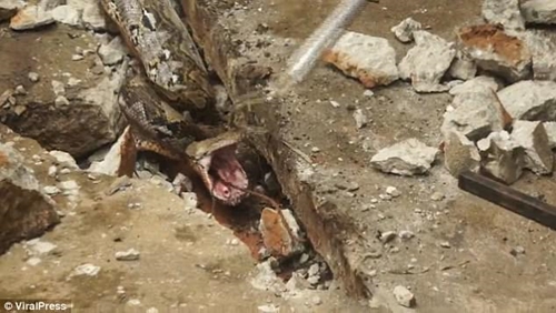 They eventually pound away at enough of the concrete to be able to pull the python out. After having its meal disturbed, the snake becomes aggressive and proves difficult to catch with the tools the rescuers have on hand.