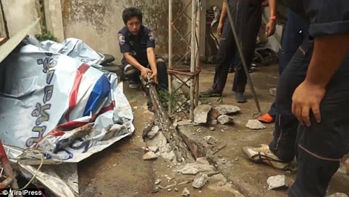 A video which emerged online, shows officers Sawang Benchait and Samut Songkhram taking a hammer to the concrete in the woman's backyard, breaking away piece by piece to reveal the large snake hiding underneath.