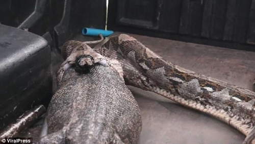 The officers are seen grabbing the long snake by its tail and lifting it as its body bulges into the boot of one of their vehicles.