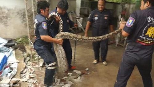The 14-foot python was captured underneath slabs of concrete at the back of a woman's house in Thailand