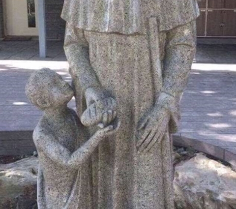 The school's new statue of a saint handing a loaf of bread to a young boy