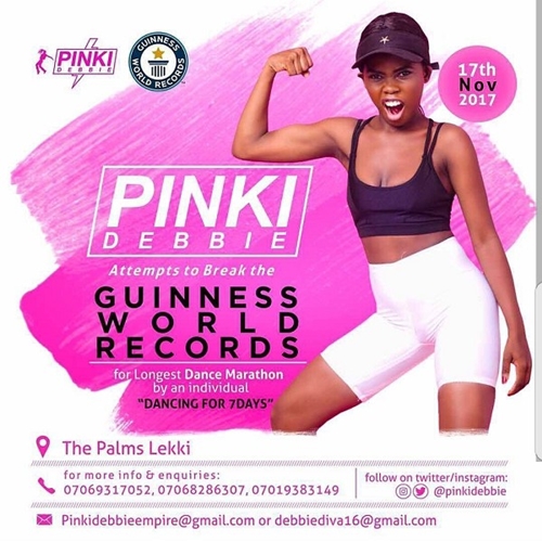 22-year-old renowned dance performer and media influencer in the Nigerian entertainment industry, Odumewu Debbie Sunmisola popularly known as “PINKIDEBBIE”, is set to break Guinness World Record for "Longest Dance" by an Individual.