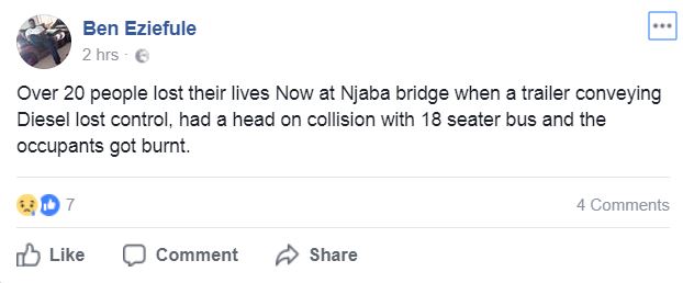 Writing on Facebook, Ben Eziefule said: "Over 20 people lost their lives Now at Njaba bridge when a trailer conveying Diesel lost control, had a head on collision with 18 seater bus and the occupants got burnt."