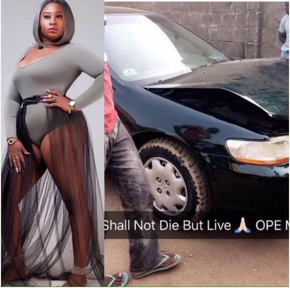 The actress took to her Instagram page to share a photo of her damaged car with caption;
