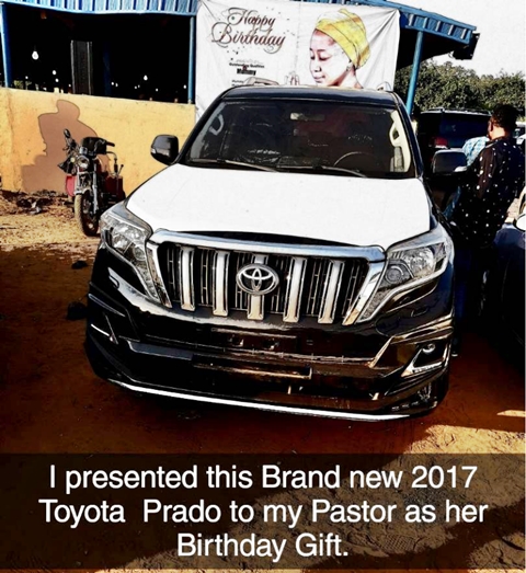 Millionaire businessman who became an online sensation after he rained cash at a wedding sometime back, has again made news after he presented a brand new 2017 Toyota Prado SUV to his pastor as her birthday gift.