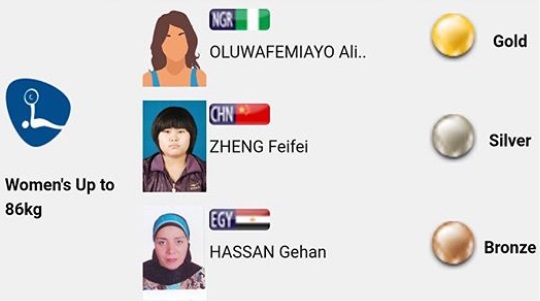 China´s Feifei Zheng (130kg) claimed silver at her first major international competition, while Egypt´s 2010 world champion Geehan Hassan (125kg) completed the podium.