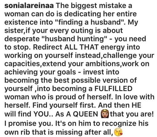 "The biggest mistake a woman can do is dedicating her entire existence into "finding a husband". My sister,if your every outing is about desperate "husband hunting" - you need to stop.