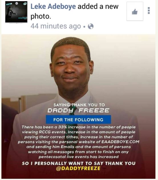 A Facebook account purportedly belonging to one Leke Adeboye, the son of the General Overseer of the Redeemed Christian Church of God, Pastor E.A. Adeboye, has thanked Daddy Freeze over his criticisms targeted at the leadership of the RCCG and other churches over alleged extortion from poor members.