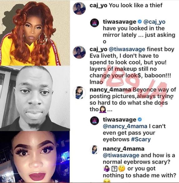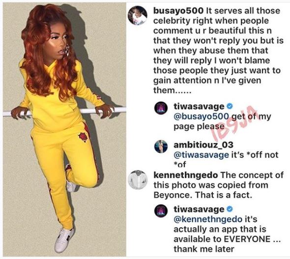 Another follower accused Tiwa Savage of copying the antics of American singer, Beyonce Knowles. She also lamented on the heavy make-ups worn by the singer.