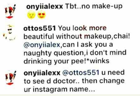 "Look more beautiful without makeup, chai! @Onyiialex, can I as you a naughty question, I dont mind drinking your pee! *winks" he commented.