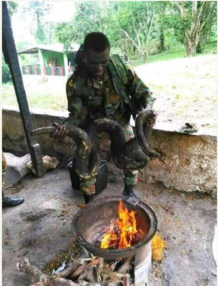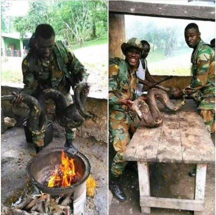 The gallant soldiers were so excited as they roasted and butchered the big-sized reptile in order to prepare a meal with it.
